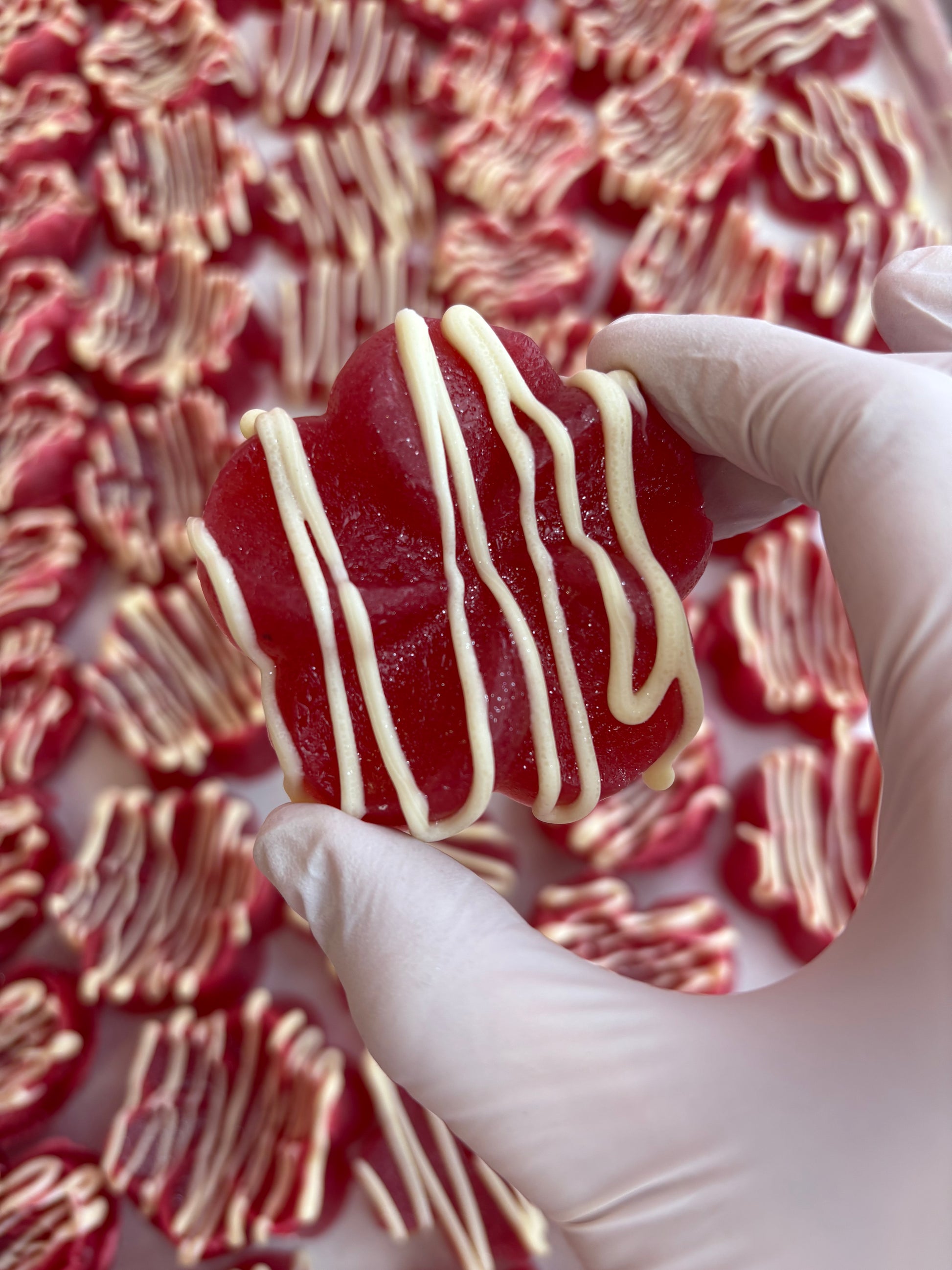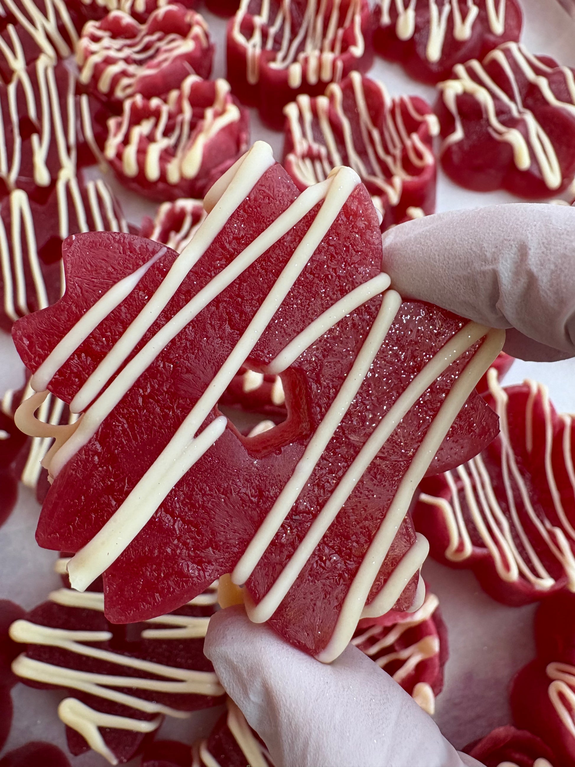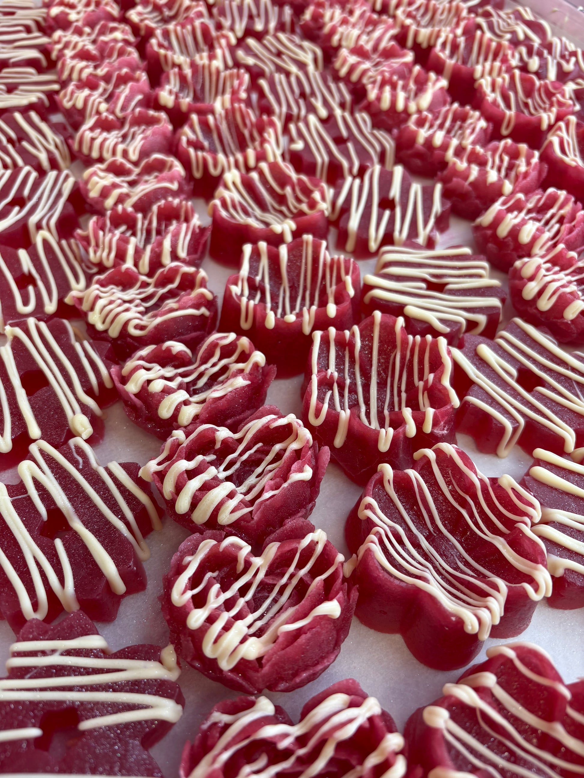 Each crystal is hand-shaped like a delicate flower, shimmering with a jewel-like crunch before melting into a soft, jelly-centered bloom. Finished with an elegant drizzle of luxurious white chocolate, this candy balances vibrant fruit intensity with creamy sweetness in the most decadent way.